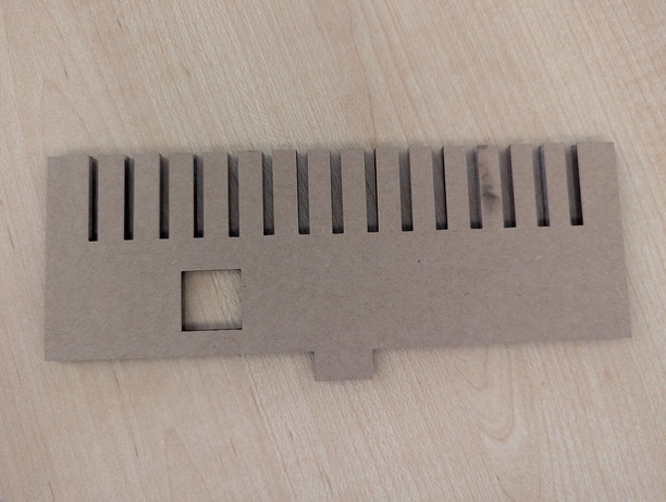 In order to figure out the kerf of the laser, we created a comb-like design. It allowed us to measure an element in the design that we knew the exact measurements of to figure out the delta between design and fabricated piece. It also allowed us to experiment with fitting the cardboard in slots of different widths to understand what dimensions lead to a tight fit that makes for stable structures.