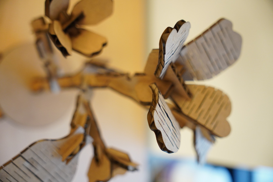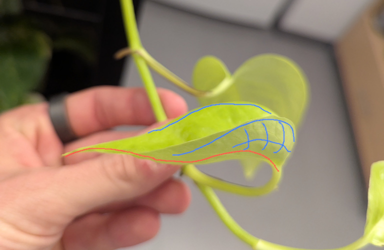 When I first saw the living hinges and patterns that allow for certain movements of the material, I was wondering how I could do true 3D structures (not just a bend in a single axis). I was wondering if I could make a leaf that, when adding a weight at the tip, would bend in the main axis but then as a consequence also pull up the sides. The below picture of our beloved pathos plant illustrates what I was hoping for. I quickly realized that I don’t know where to start when it comes to simulating the effects of cut patterns and abandoned the idea of truly 3D leaves. It’s still a question that’s spiraling around in my head, though.