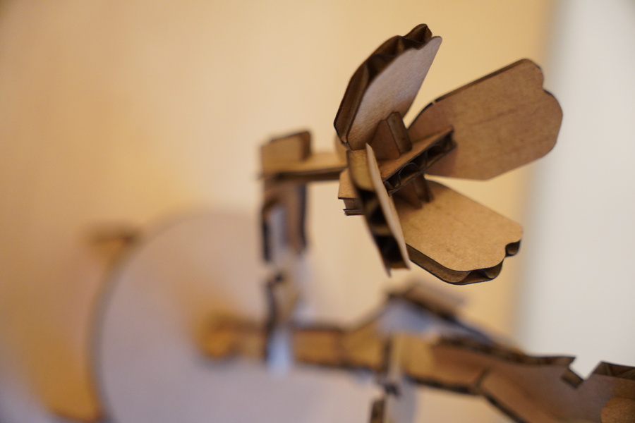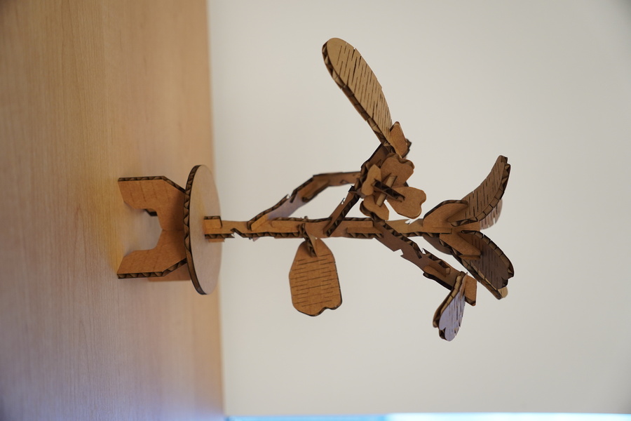 Dan had showed us how to use the xtool laser cutter and using it myself was actually very straight-forward. As I alluded to earlier, my estimated size was off by a bit, though, - and while I liked the more fragile nature of the pieces I made, they were just not structurally sound enough to be used. I used Fusion to scale all the pieces to 150% and also designed a little stand for the flower. Scaling the pieces was relatively easy as the slots in the design were driven by a width parameter anyway.