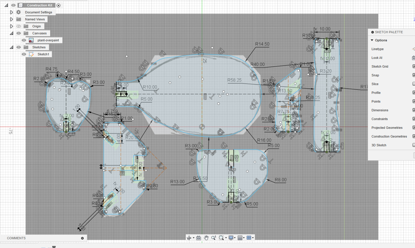After bringing this sketch into Fusion as a reference, I tried to figure out the physical dimensions that my plants should have. This was a step that I got wrong. Being unfamiliar with the cardboard material (and the frequency of the corrugation in particular), I based my estimate more on aestetics and ignored feasibility. We will come back to this. With my (unfortunate) measurements, I proceeeded to create the sketch. As can be seen in the following pictures, using fillets to create organic shapes became a cluttered affair pretty quickly. I will need to learn if and how I can use proper Bezier style curves in Fusion.